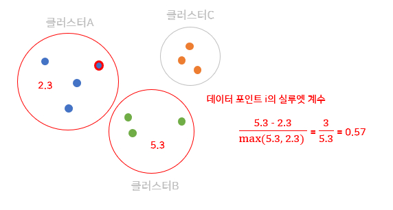클러스터 B와 C 중 데이터 포인트 i와 가까운 클러스터(=이웃 클러스터)는 B이므로 \(b(i)\) 값은 5.3이 되며, \(a(i)\), \(b(i)\) 값으로 데이터 포인트 i의 실루엣 계수 \(s(i)\) 값을 구한다.