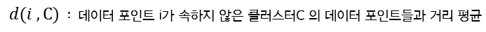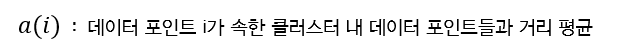 우선 데이터 포인트 i가 속한 클러스터 A 안에 있는 다른 데이터 포인트들과의 거리 평균을 구한다.