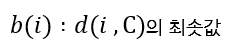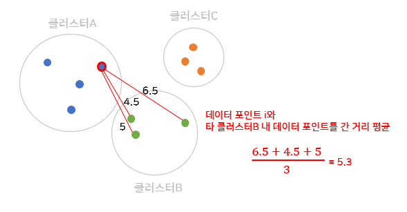 그리고, 데이터 포인트 i가 속하지 않은 클러스터 B의 데이터 포인트들과 거리 평균을 구하고, 마찬가지로 클러스터 C의 데이터 포인트들과 거리 평균을 구한다.