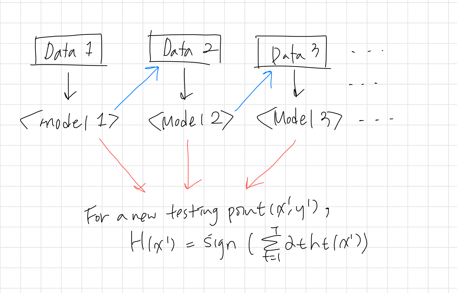 - random guessing보다 약간 더 잘하는 week model에 대하여, 앞선 모델이 잘 풀지 못했던 어려운 case에 가중치를 부여해서(reweight) 결국에는 strong model을 만들고자 함