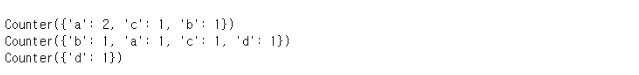 - Counter 클래스는 list, tuple, set 객체를 이용하여 key-value 쌍 생성